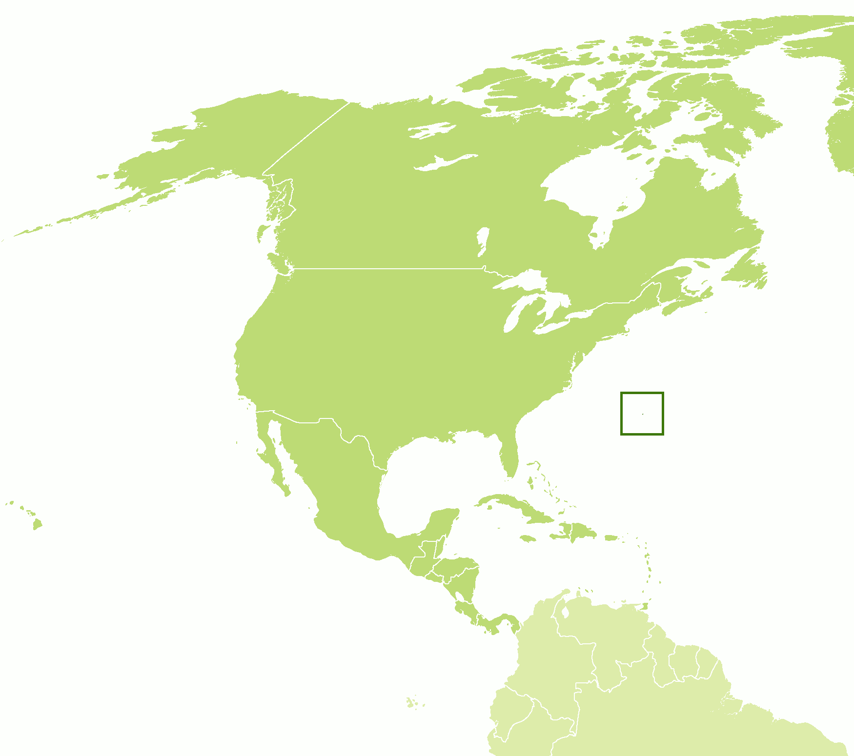 The island of Bermuda, an area of only 52 sq km (20 sq mi), lies in the North Atlantic in latitude 32°N at a distance of 1,125 km (700 miles) from the United States. It has a subtropical climate much influenced by the warmth of the North Atlantic waters, for it is fully in the path of the warm Gulf Stream. Summers are warm to hot and the winters mild with occasional warm, sunny days. The climate is generally mild and humid, with a mean annual temperature of 22°C (72°F) and average rainfall of 1,500 millimeters (60 inches).